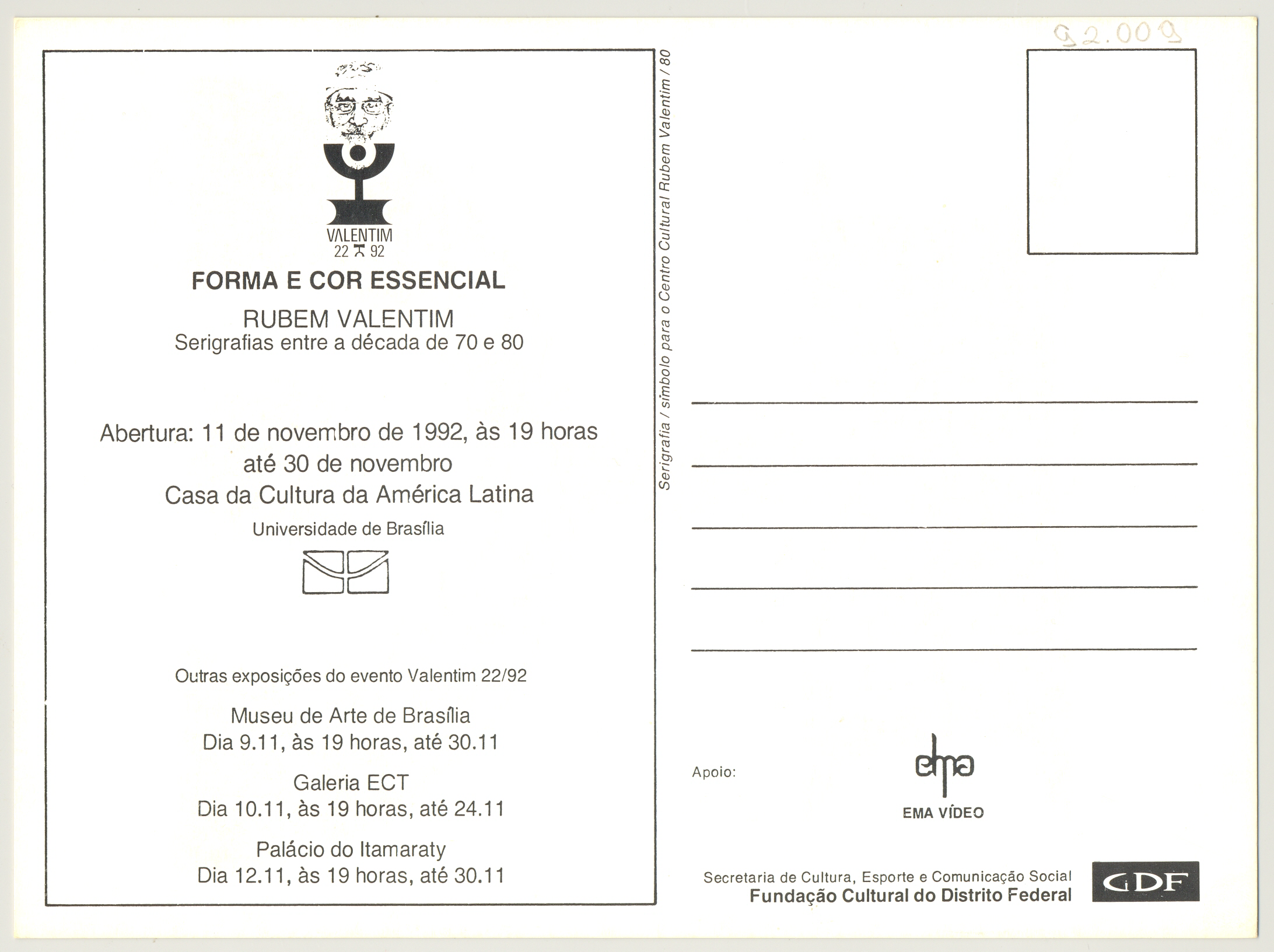 Forma e Cor Essencial – Serigrafias Voltar 17 de maio de 2019 by fciadm   Documento 92.009 frente Baixar Anexos 92.009 verso Metadados Miniatura Compartilhe Nome do eventoForma e Cor Essencial - SerigrafiasCom imagem?SimTipo do eventoExposiçãoAno1992Início11 de NovembroTérmino30 de NovembroDescrição do eventoHomenagem ao artista Rubem ValentinDiretorRenée Gunzburger SimasArtistaRubem ValentimLocalCasa da Cultura da América Latina > GaleriasDocumento relacionado92.009 | 92.018 | 92.019 | 92.020 | 92.021 Continuar navegando Pinturas Mostra Conjunta Direitos do Homem Posters gráficos; Invasão de Terras Gravuras de Juazeiro do Norte Voltar para a lista de itens