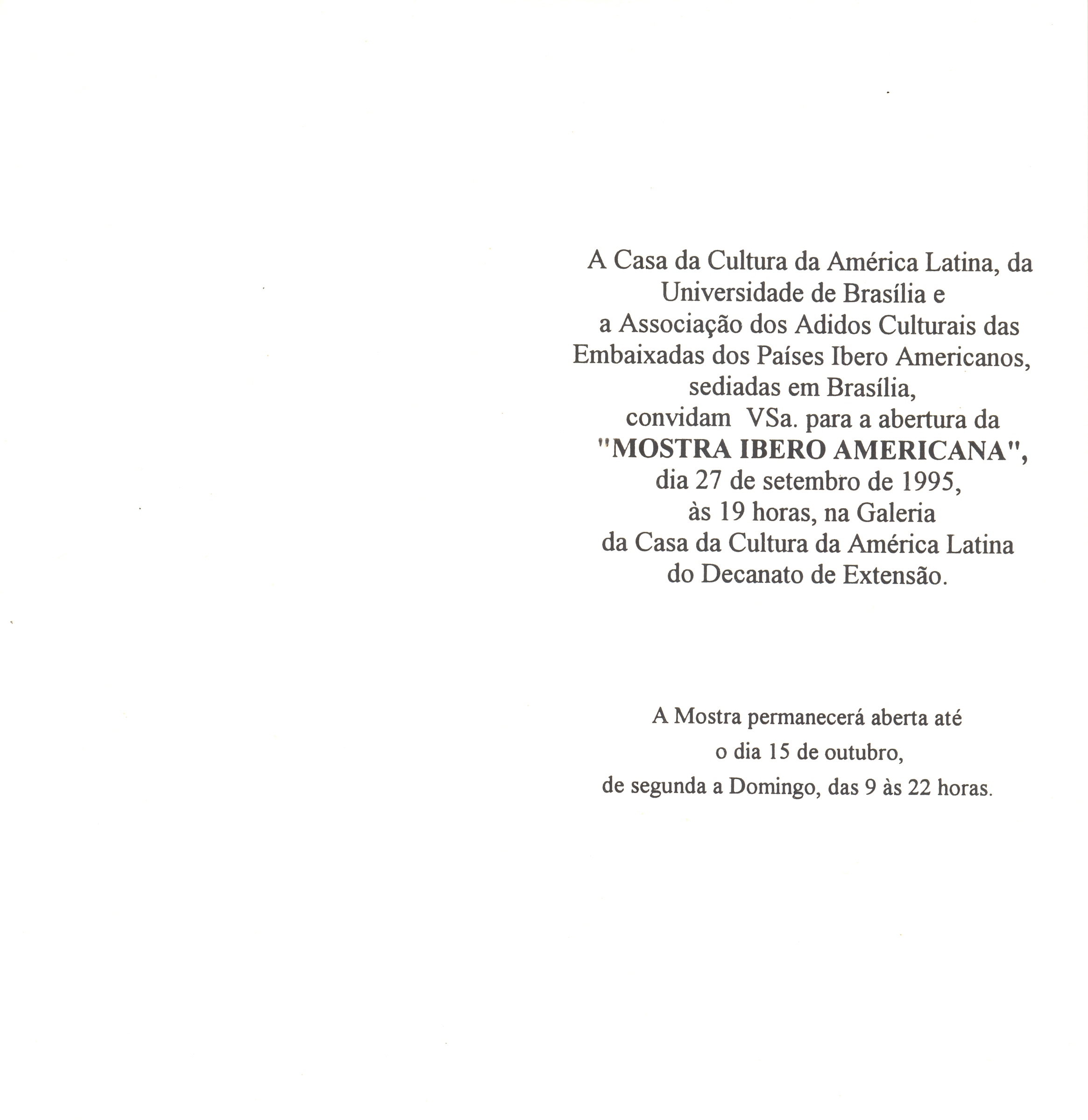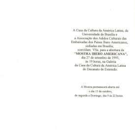 Mostra Ibero – Americana Voltar 17 de maio de 2019 by fciadm   Documento 95.018 (2) Baixar Anexos 95.018 (1) 95.018 (3) 95.019 interna Metadados Miniatura Compartilhe Nome do eventoMostra Ibero - AmericanaCom imagem?SimTipo do eventoExposiçãoAno1995Início27 de SetembroTérmino15 de OutubroDescrição do eventoMostra de peças do acervo e cedidas por embaixadas dos países ibero-americanos em comeoração aos 50 anos da Organização das Nações Unidas para a Educação, a Ciência e a Cultura (UNESCO)DiretorRenée Gunzburger SimasLocalCasa da Cultura da América Latina > GaleriasDocumento relacionado95.018 | 95.019 | 95.024 | 95.032 Continuar navegando 300 Peças em Bambu Casa da Cultura da América Latina Voltar para a lista de itens