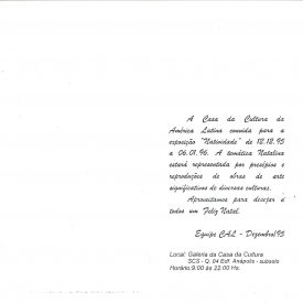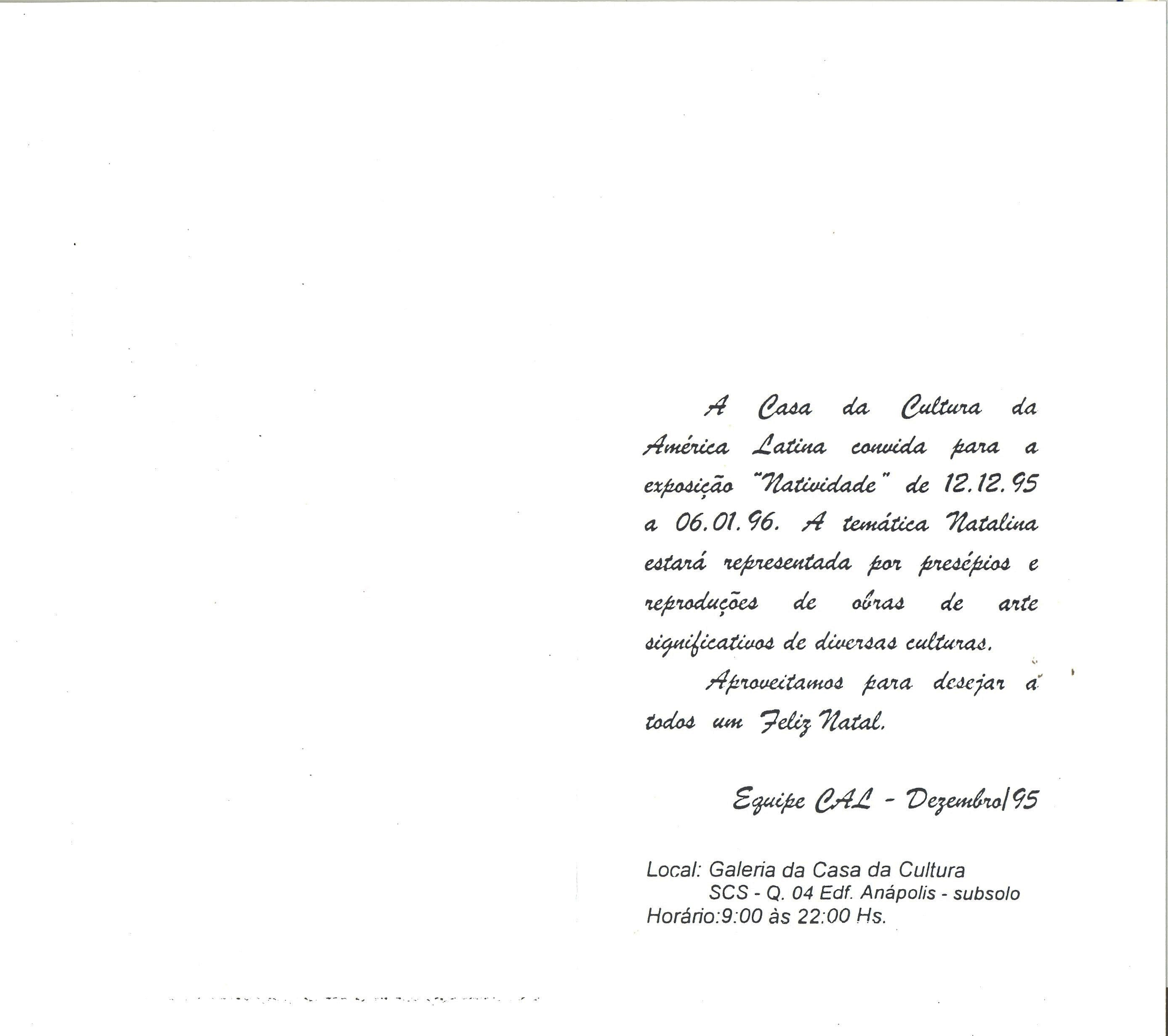 Natividade Voltar 17 de maio de 2019 by fciadm   Documento 95.022 externa Baixar Anexos 95.022 interna Metadados Miniatura Compartilhe Nome do eventoNatividadeCom imagem?SimTipo do eventoExposiçãoAno1995Início12 de DezembroTérmino6 de Janeiro (1996)Descrição do eventoMostra de presépios e reproduções de obras de arte com temática da natividadeDiretorRenée Gunzburger SimasLocalCasa da Cultura da América Latina > GaleriasDocumento relacionado95.022 | 95.035 Continuar navegando Casa da Cultura da América Latina Mostra da Produção das Universidades Brasileiras Voltar para a lista de itens