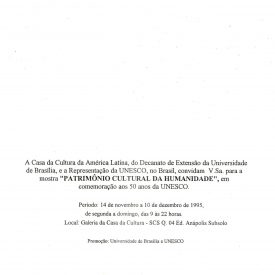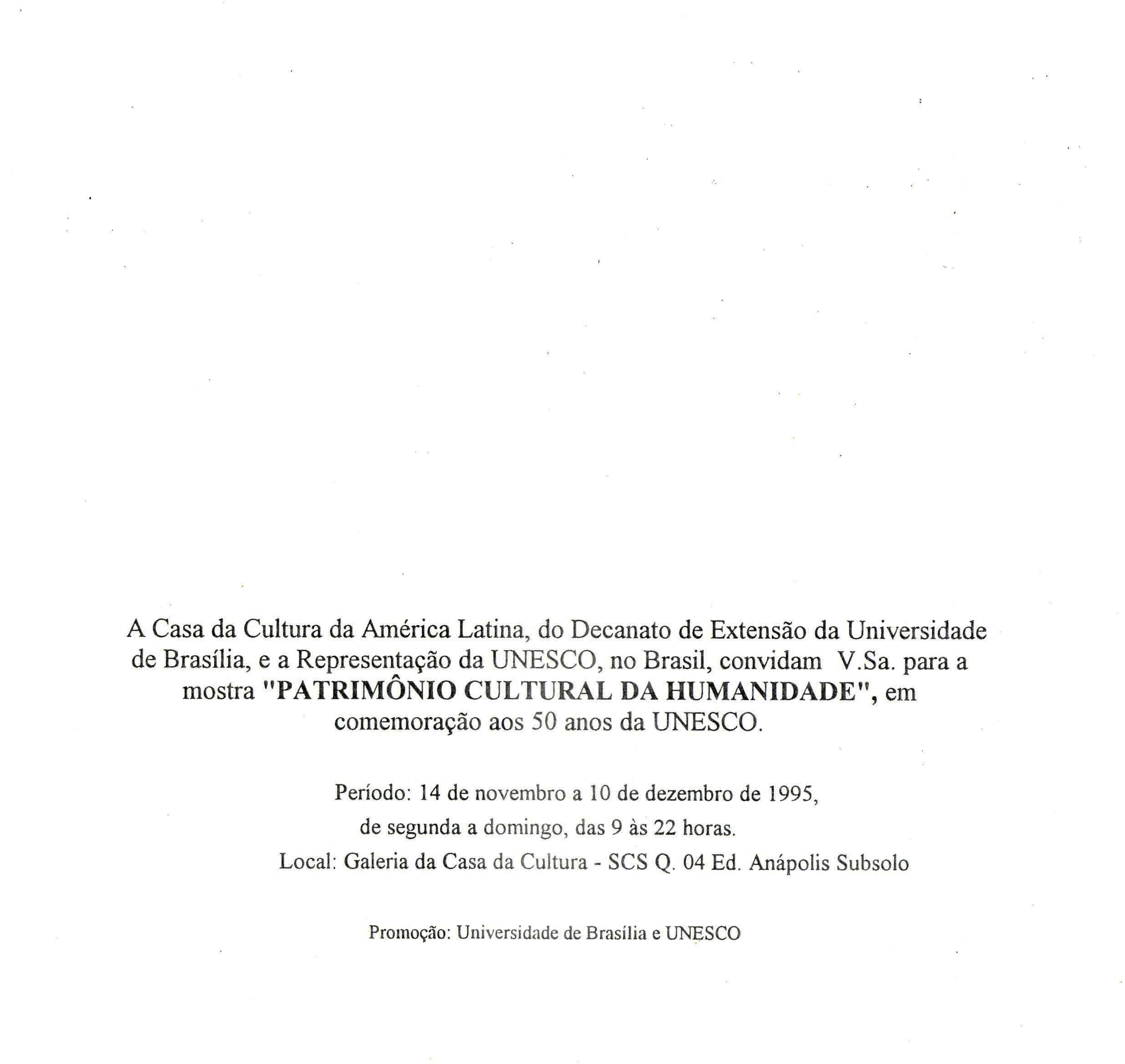 Patrimônio Cultural da Humanidade Voltar 17 de maio de 2019 by fciadm   Documento 95.021 externa Baixar Anexos 95.021 interna Metadados Miniatura Compartilhe Nome do eventoPatrimônio Cultural da HumanidadeCom imagem?SimAno1995Início14 de NovembroTérmino10 de DezembroDescrição do eventoMostra em comemoração aos 50 anos da Organização das Nações Unidas para a Educação, a Ciência e a Cultura (UNESCO)DiretorRenée Gunzburger SimasLocalCasa da Cultura da América Latina > GaleriasDocumento relacionado95.021 | 95.033 Continuar navegando Casa da Cultura da América Latina Mostra da Produção das Universidades Brasileiras Voltar para a lista de itens