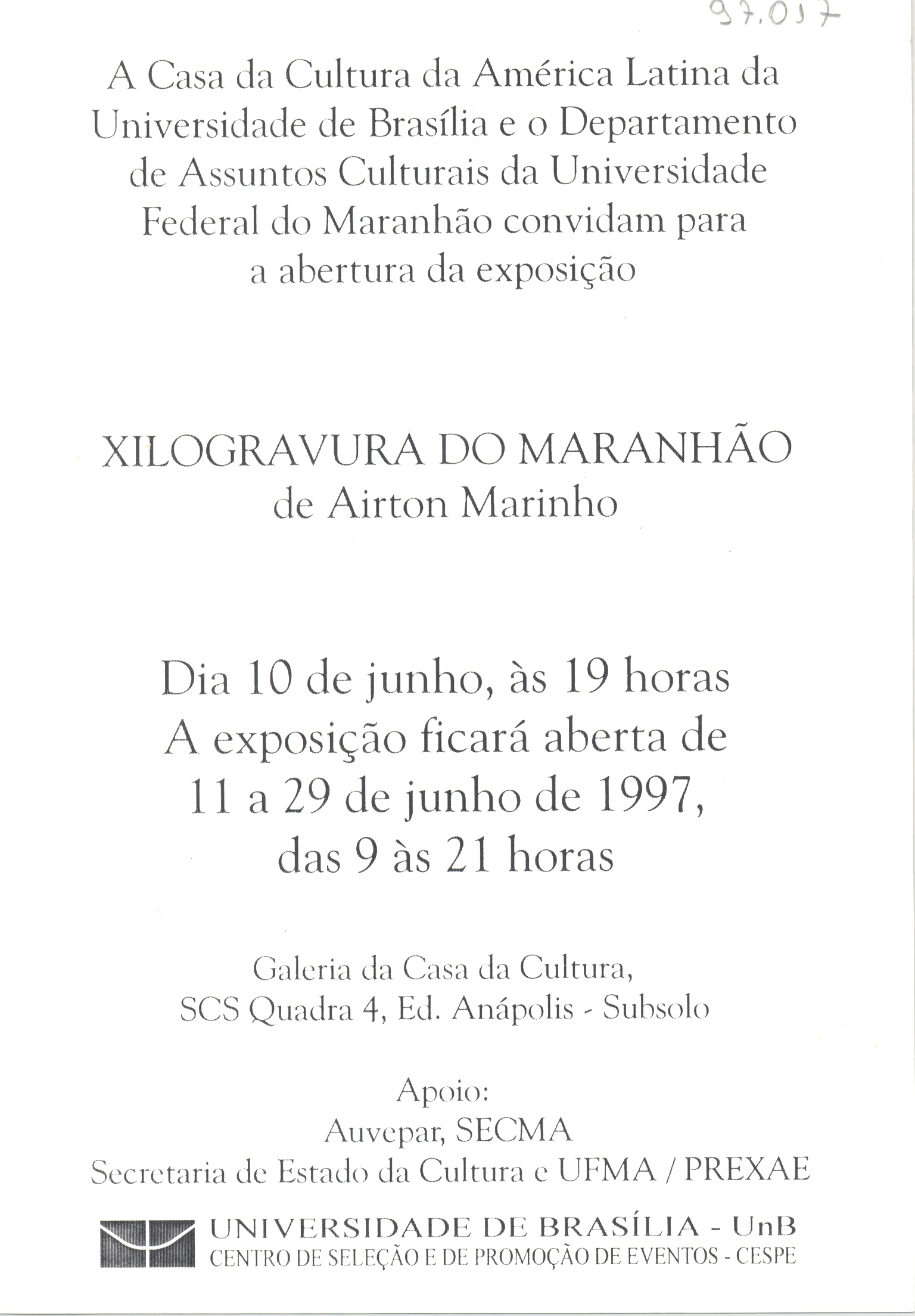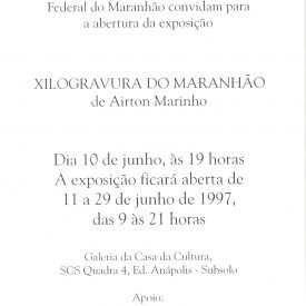 Xilogravura do Maranhão Voltar 17 de maio de 2019 by fciadm   Documento 97.017 frente Baixar Anexos 97.017 verso 97.018 1 97.018 2 Metadados Miniatura Compartilhe Nome do eventoXilogravura do MaranhãoCom imagem?SimTipo do eventoExposiçãoAno1997Início10 de JunhoTérmino29 de JunhoDiretorRenée Gunzburger SimasArtistaAirton MarinhoLocalCasa da Cultura da América Latina > GaleriasDocumento relacionado97.017 | 07.018 | 97.019 | 97.020 | 97.055 Continuar navegando Juruna Gravura e Brasil Voltar para a lista de itens
